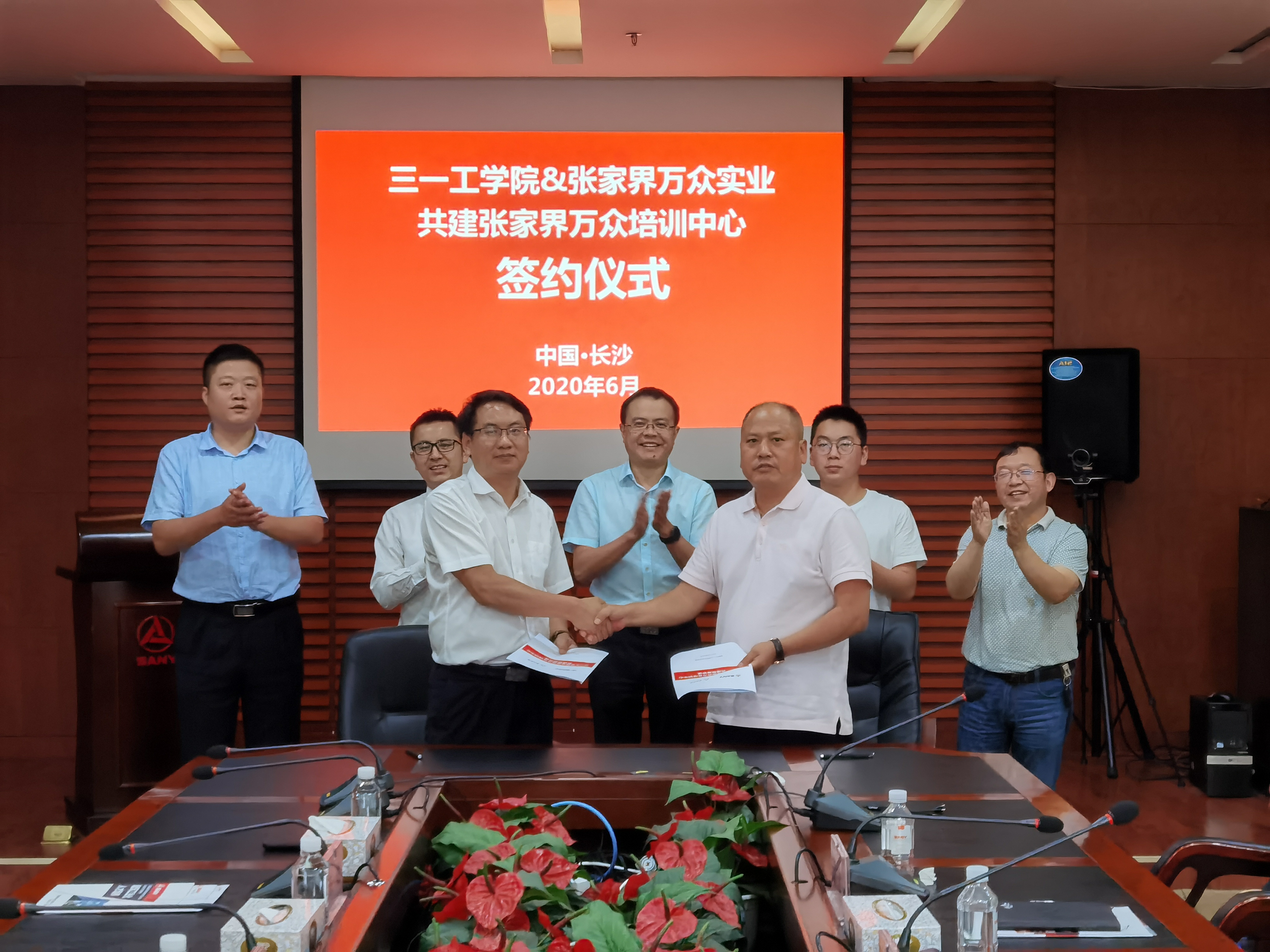 2020年6月4日,在長(zhǎng)沙市三一工學(xué)院的會(huì)議室,張家界萬眾張家界萬眾實(shí)業(yè)有限公司田開鋒董事長(zhǎng)、三一工學(xué)院胡軍林院長(zhǎng)在熱烈的掌聲中共同簽署了《三一工學(xué)院張家界萬眾培訓(xùn)中心共建框架協(xié)議》并交換了文本。