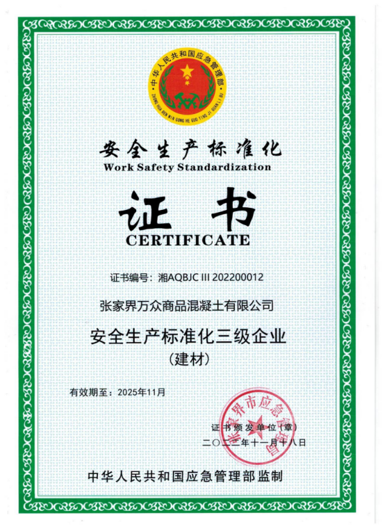 商品混凝土:安全標(biāo)準(zhǔn)化三級(jí)企業(yè)