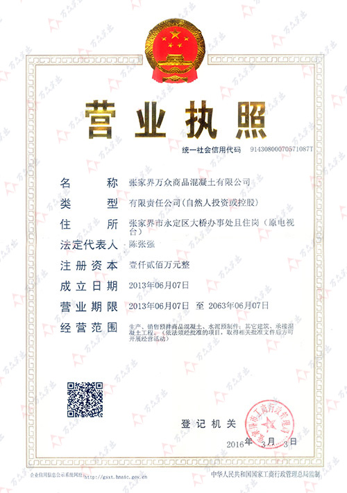 張家界萬眾商品混凝土有限公司營業(yè)執(zhí)照