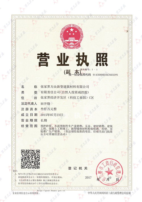 張家界萬眾新型建筑材料有限公司營業(yè)執(zhí)照